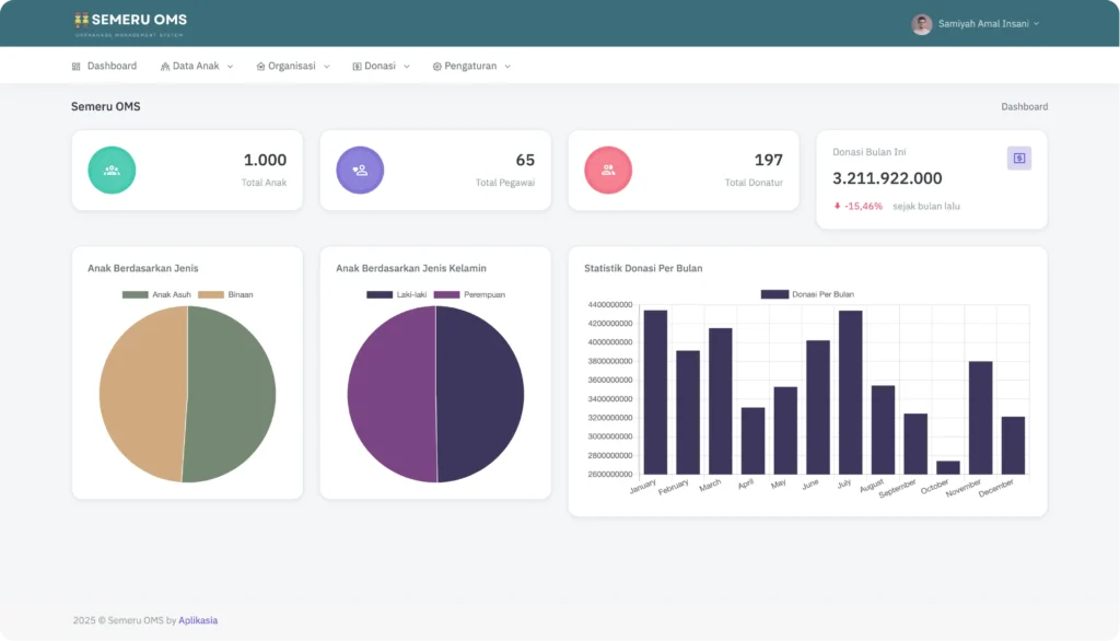 Ringkasan kondisi panti, jumlah anak, status donasi, dan aktivitas harian tampil dalam satu dashboard yang mudah dipahami.